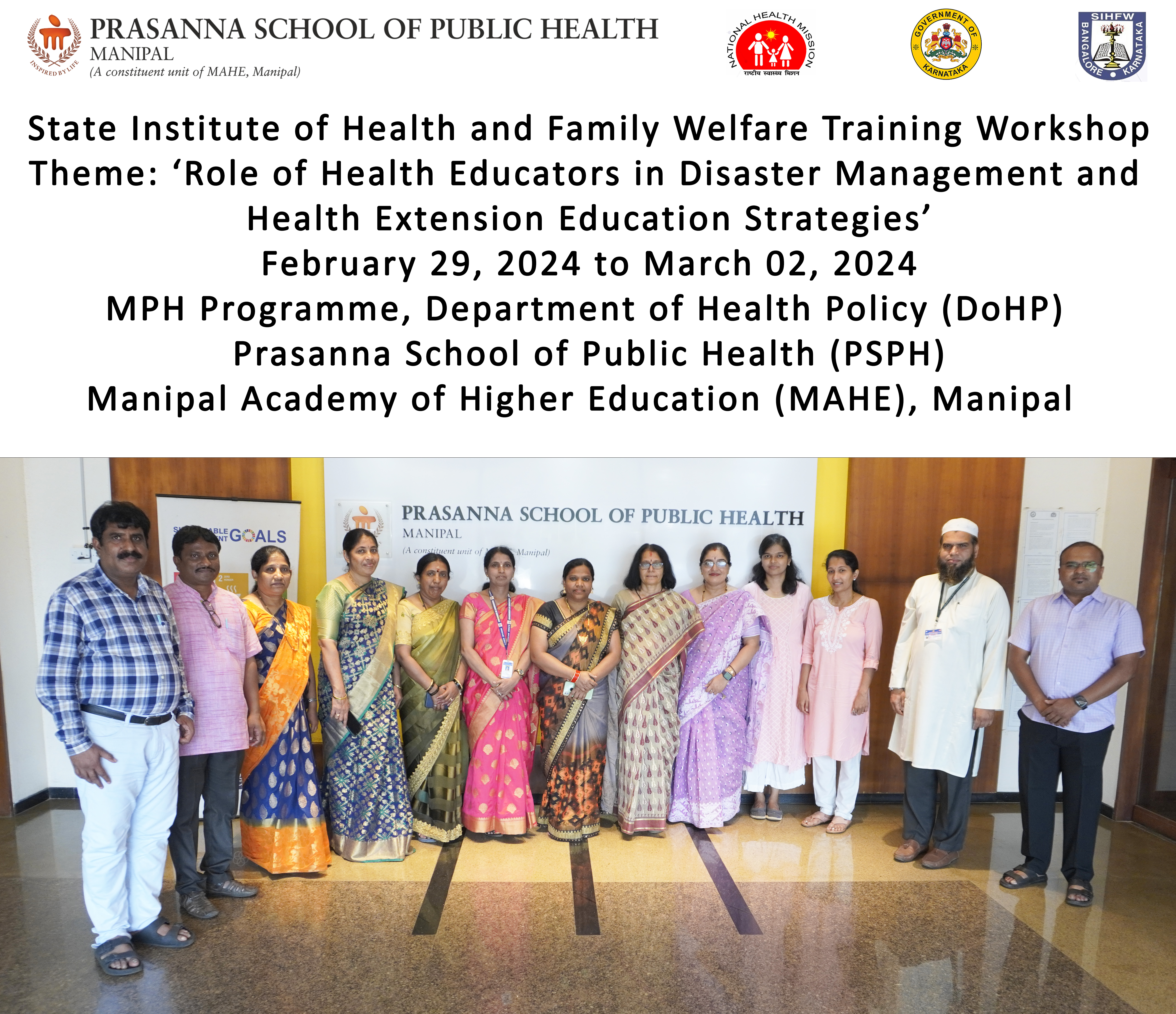 MPH Programme, Department of Health Policy (DoHP), Prasanna School of Public Health (PSPH), Manipal Academy of Higher Education (MAHE), Manipal organized the State Institute of Health and Family Welfare Training Workshop based on the Theme ‘Role of Health Educators in Disaster Management and Health Extension Education Strategies’ on the Premises of PSPH, MAHE, Manipal; places in and around PSPH, MAHE, Manipal; Udupi District from February 29, 2024 to March 02, 2024.
