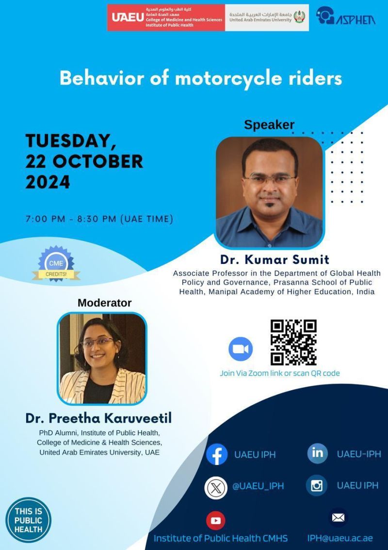 Dr Kumar Sumit (Associate Professor, GPHPG, PSPH, MAHE, Manipal & Honorary Lecturer, School of Medicine, Medical Sciences and Nutrition, University of Aberdeen, Scotland, United Kingdom) delivered a guest lecture based on the topic “The Global Behaviour of Motorcycle Riders from a Public Health Perspective” in the webinar organised for the Network of Public Health Professionals in Collaboration with ASPHER (Association of Schools of Public Health in the European Region) Virtually through Zoom at the College of Medicine and Health Sciences, Institute of Public Health, United Arab Emirates University on Tuesday, October 22, 2024 (07:00 PM [UAE Time]).