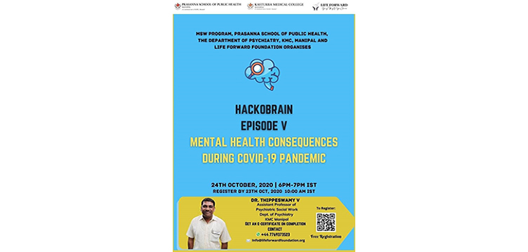 Department of Global Health together with the Department of Psychiatry, Kasturba Medical College (KMC), Manipal and Life Forward Foundation organized ‘Hackobrain - Episode 5 - ‘Mental Health Consequences During COVID-19 Pandemic’ on October 24, 2020.