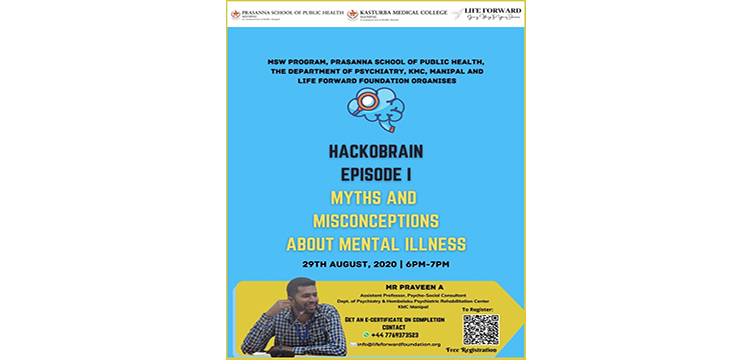 MSW Program, Prasanna School of Public Health, The Department of Psychiatry, KMC, Manipal and Life Forward Foundation is Organizing a Webinar: Hackobrain - Episode 1 - Myths and Misconceptions about Mental Illness on August 29, 2020.