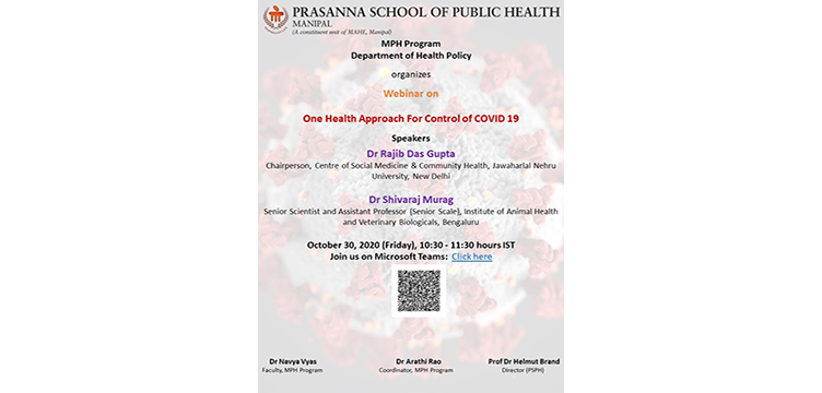 MPH Program, Department of Health Policy is organizing a webinar on "One Health Approach For Control of COVID 19" through Microsoft Teams on October 30, 2020 (Friday), 10:30 - 11:30 hours IST. Dr. Rajib Das Gupta, Chairperson, Centre of Social Medicine & Community Health, Jawaharlal Nehru University, New Delhi and Dr. Shivaraj Murag, Senior Scientist & Assistant Professor (Senior Scale), Institute of Animal Health and Veterinary Biologicals, Bengaluru will be the invited speakers for the webinar.