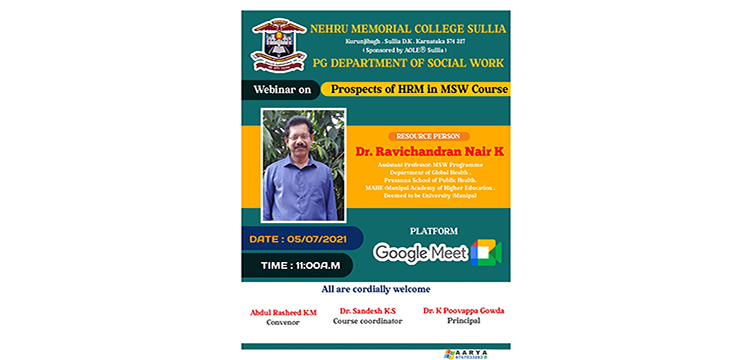 Dr Ravichandran Nair K (Faculty, MSW Program, Department of Global Health, PSPH) was the resource person for the webinar "Prospects of HRM in MSW Course" organized by the PG Department of Social Work, Nehru Memorial College, Sullia, Karnataka on July 05, 2021.