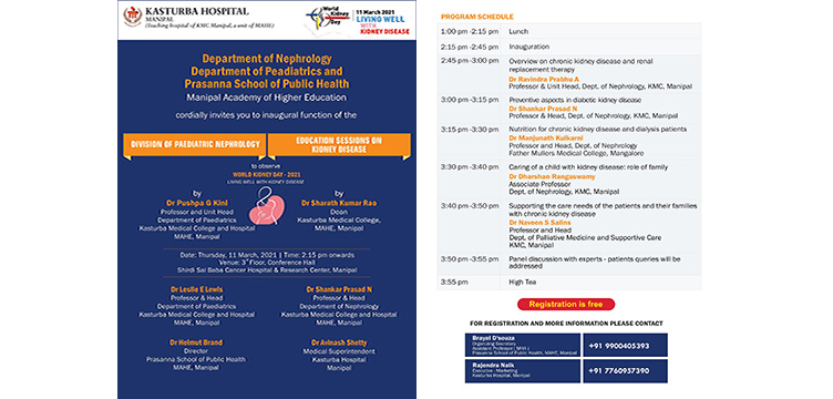 Department of Nephrology, Department of Peadiatrics and Prasanna School of Public Health, Manipal Academy of Higher Education is Organizing Education Sessions on Kidney disease to observe World Kidney Day – 2021.