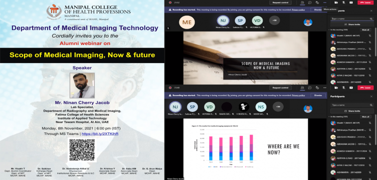 Department of Medical Imaging Technology, MCHP, MAHE, Manipal organised webinar. Mr. Ninan Cherry Jacob, batch 2011 from Fatima College of Health Sciences, UAE delivered a talk on the "Scope of Medical Imaging, Now & future", on 08.11.2021, 6:00-7:00 pm through Microsoft teams. He Secured master’s degree in Medical Imaging Technology from SOAHS, Manipal University, Udupi, Karnataka in the year 2013 is currently working as Lab Specialist, Department of Radiography and Medical Imaging, Fatima College of Health Sciences, Institute of Applied Technology, Near Tawam Hospital, Al Ain, UAE. The webinar was attended by department alumni, students and faculty member of our Institute. Dr.Saikiran. P, Incharge Head, Department of Medical Imaging Technology, MCHP Manipal welcomed the speaker and gave vote of thanks. Nearly 109 participants have attended the session.