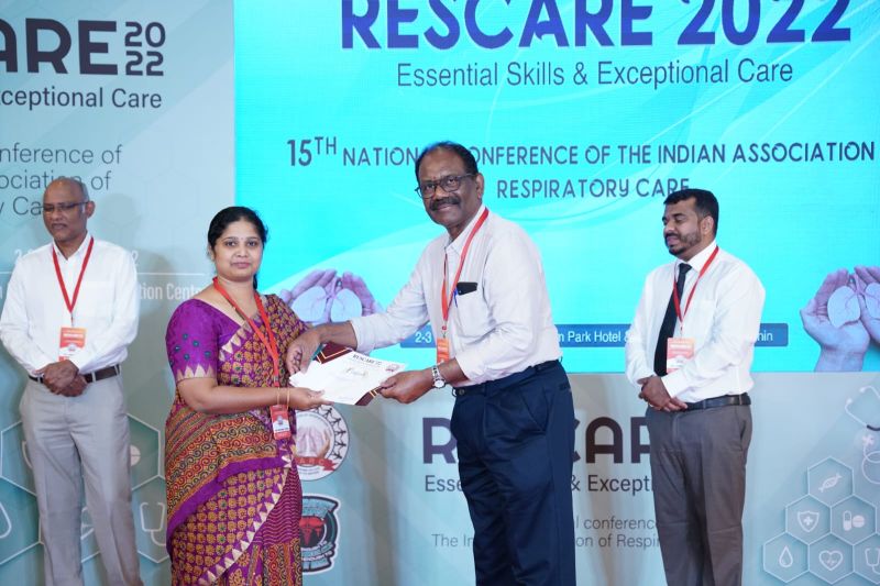 In the 15th National Conference conducted by the Indian Association of Respiratory Care - RESCARE '22, Kochi, Kerala, India Ms. Pratibha Todur, In-charge Head of the Department won the "Best Scientific Paper Award". Her hard work and dedications towards the research was well recognized during the conference.