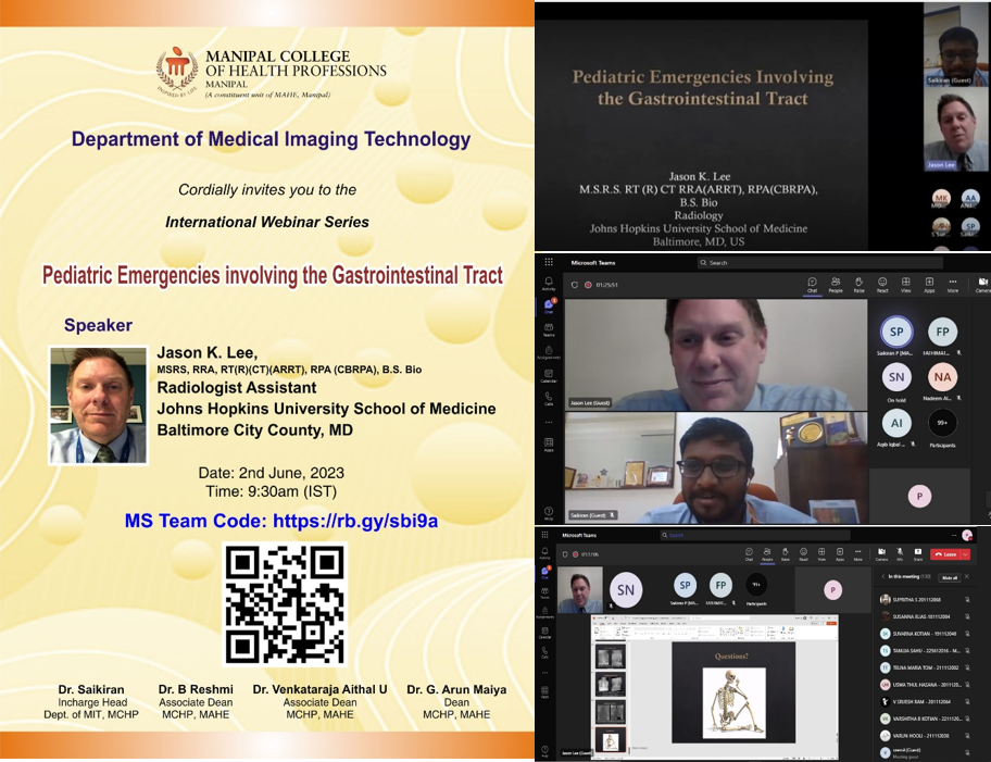 Department of Medical Imaging Technology, MCHP, MAHE, Manipal organised international webinar. Mr. Jason K Lee from Johns Hopkins University School of Medicine, Baltimore City Country, MD delivered a talk on "Pediatric emergencies involving the gastrointestinal tract", on 2nd June 2023, 9.30 am through Microsoft teams. He Secured master’s degree in Radiologic Sciences, Radiology Assistant from Midwestern State University, Wichita , Texas and is currently working as Radiologist Assistant, Johns Hopkins University School of Medicine, Baltimore City Country, MD. The webinar was attended by department alumni, students, and faculty member of our Institute. Dr.Saikiran. P, Incharge Head, Department of Medical Imaging Technology, MCHP Manipal welcomed the speaker and proposed the vote of thanks.