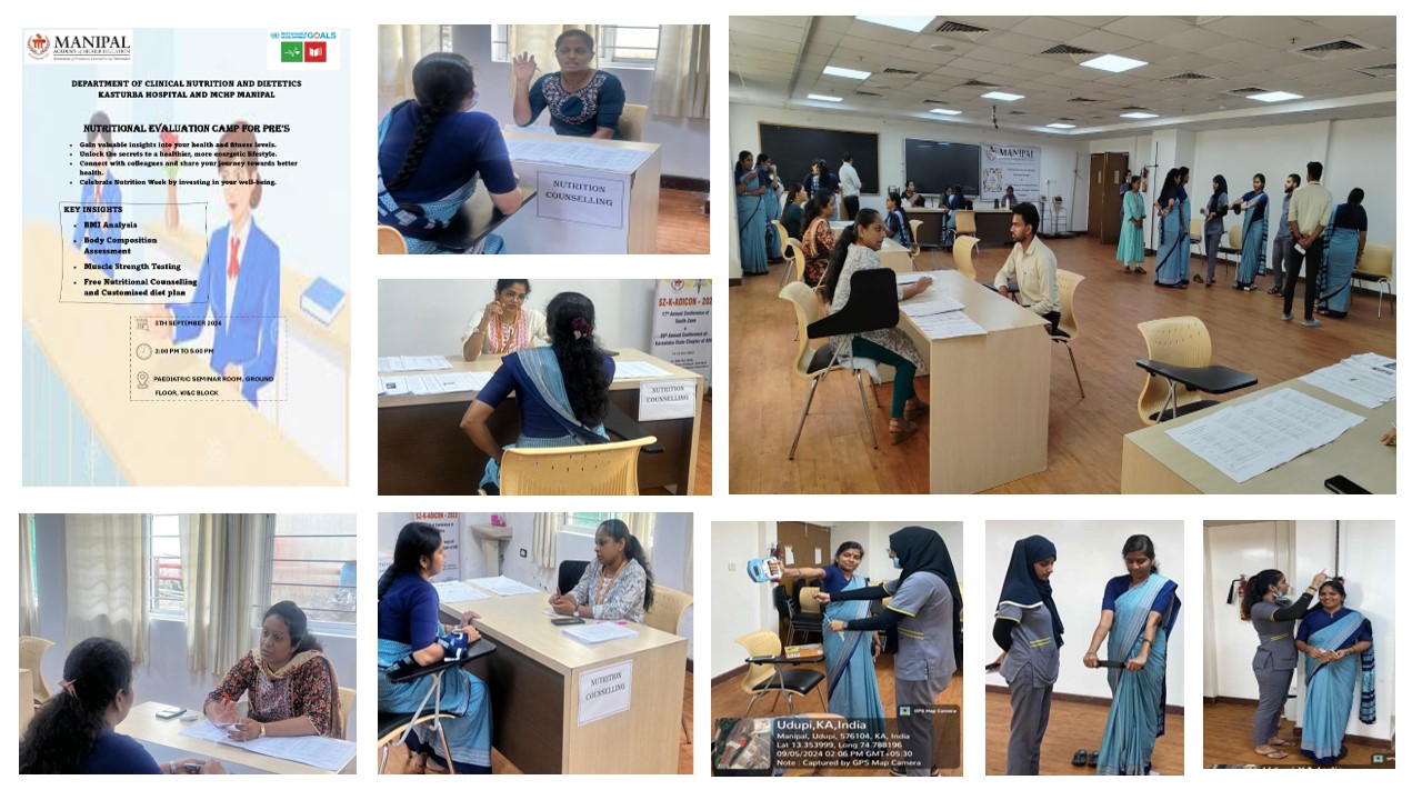 As a part of National Nutrition Week 2024, Clinical Nutrition and Dietetics Program, Manipal College of Health Professions and Department of Clinical Nutrition and Dietetics, Kasturba Hospital,Manipal organized Nutritional evaluation camp for PRE’s on 5th September 2024. Participants were registered at the start of the camp, where their height and weight were measured. A complete body composition analysis and hand grip strength assessment were also conducted. Interns assisted in measuring height, weight, body composition, and hand grip strength. Following the assessments, participants were directed to nutrition counseling, where dietitians provided personalized dietary advice based on the results.
