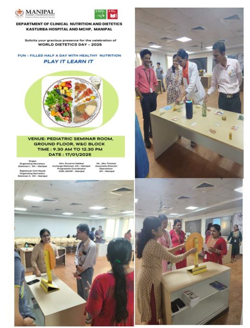As part of World Dietetics Day 2025, a series of engaging and interactive games was conducted to raise awareness about nutrition in a fun and educational manner. The program, organized for the technical and security staff of Kasturba Hospital, Manipal, was held on 17/01/2025 at the Pediatric Seminar Hall, Kasturba Hospital, Manipal, from 9:30 AM to 12:30 PM.