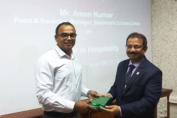 Career in Hospitality: Guest talk by Mr Aman Kumar A guest talk on “Career in Hospitality” was organized for the students of 31st Course BHM. The talk was delivered by Mr. Aman Kumar Food & Beverage Manager, Seabourn Cruise Lines on 20 March 2017 at WGSHA, Manipal. The speaker gave a brief introduction of the cruise industry and then touched upon the growth, future potential and challenges pertaining to the industry. This was followed by a Question & Answer session where Mr Kumar answered queries on: >> Career opportunities in the cruise industry – job positions, salary and other benefits offered, career track, professional growth and job satisfaction. >> The difference between a career in hospitality on land and in hotels and on water and in cruise lines- challenges and opportunities. >> Problems facing the growth and expansion of cruise industry in India. >> Importance of hygiene for food handlers and ways and means to prevent outbreak of foodborne illness on ships.