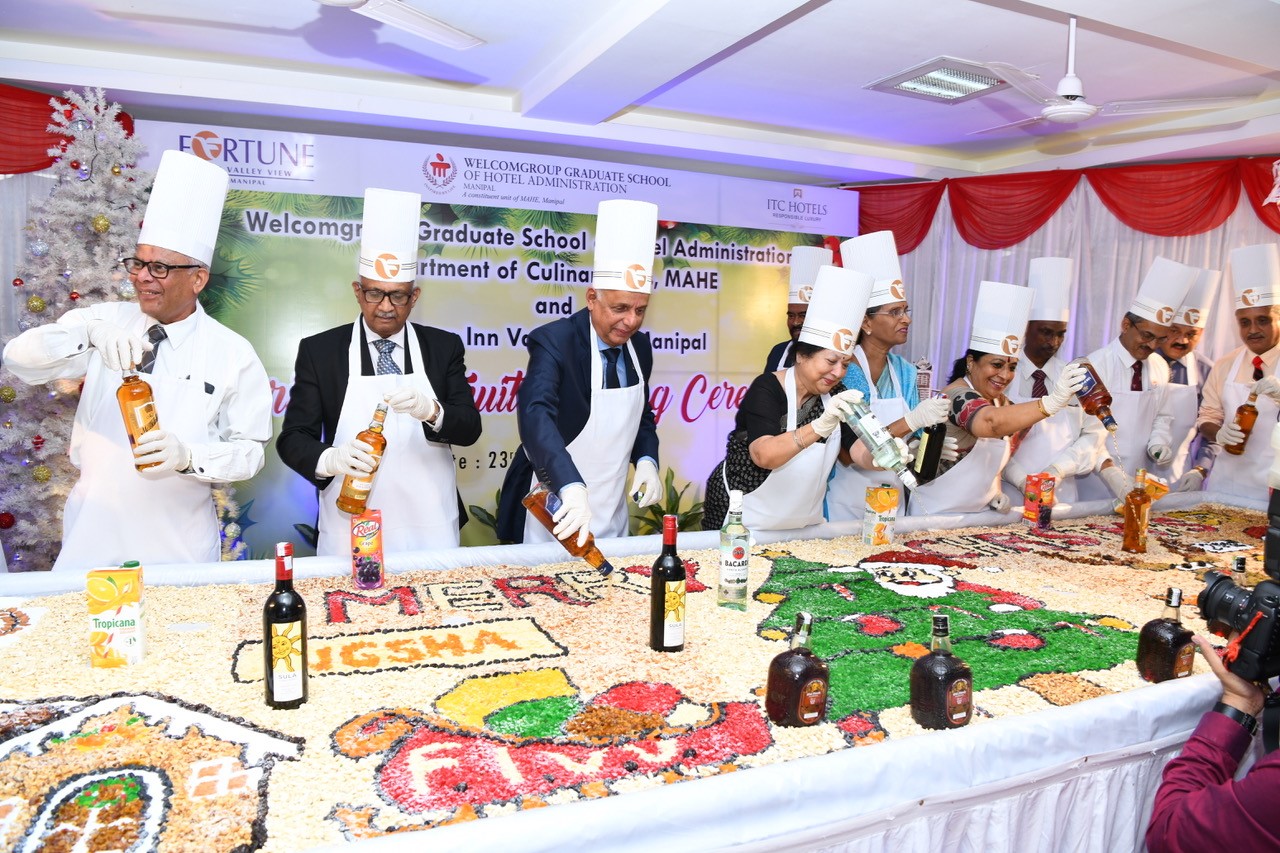 The Fruit mixing ceremony being a traditional ritual marks the arrival of the Harvest Festival and thus all the freshly harvested fruits and nuts go in the making of the conventionally loved Christmas dessert- the Plum Cake. As it was done religiously centuries ago, the fruits and nuts are soaked in Rum and Brandy which when used in the dessert enhances the flavor and adds warmth to the final Cake. But here at WGSHA, it was done a little different. Rather than just mixing the nuts and fruits with the required alcohol, they are artistically arranged on a huge table representing the highlighting characteristics of the beautiful Christmas festival. Bottles of the wine and alcohol to be poured were gracefully made to stand around the arrangement and silver coins were placed. These coins represent good luck and charm for the rest of the year for those who find it in their cakes post baking and distribution. This ritual is performed in a very homely environment wherein each member of the family takes part in the ceremony, highlighting a sense of togetherness and harmony. In this case, the Chief Guest- Madam Vasanthi Pai, dignitaries of MAHE, proud 10th Course BHM Alumni, Principal of the College- Chef K Thiru, General Manager of FIVV Hotel- Mr Sanjay Pant, the faculty and students performed the task of pouring the alcohol and mixing everything evenly. Furthermore, they were encouraged to try their hand at finding the hidden silver coins too.