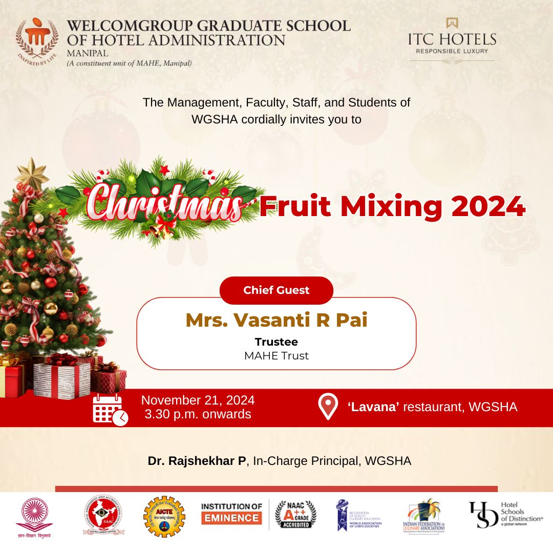 We, WGSHA, continue with the tradition of celebrating Xmas fruit mixing on 21st November 2024 along with the MAHE leadership team and students of WGSHA in the presence of esteemed Chef Guest Madam Vasanti Pai.
