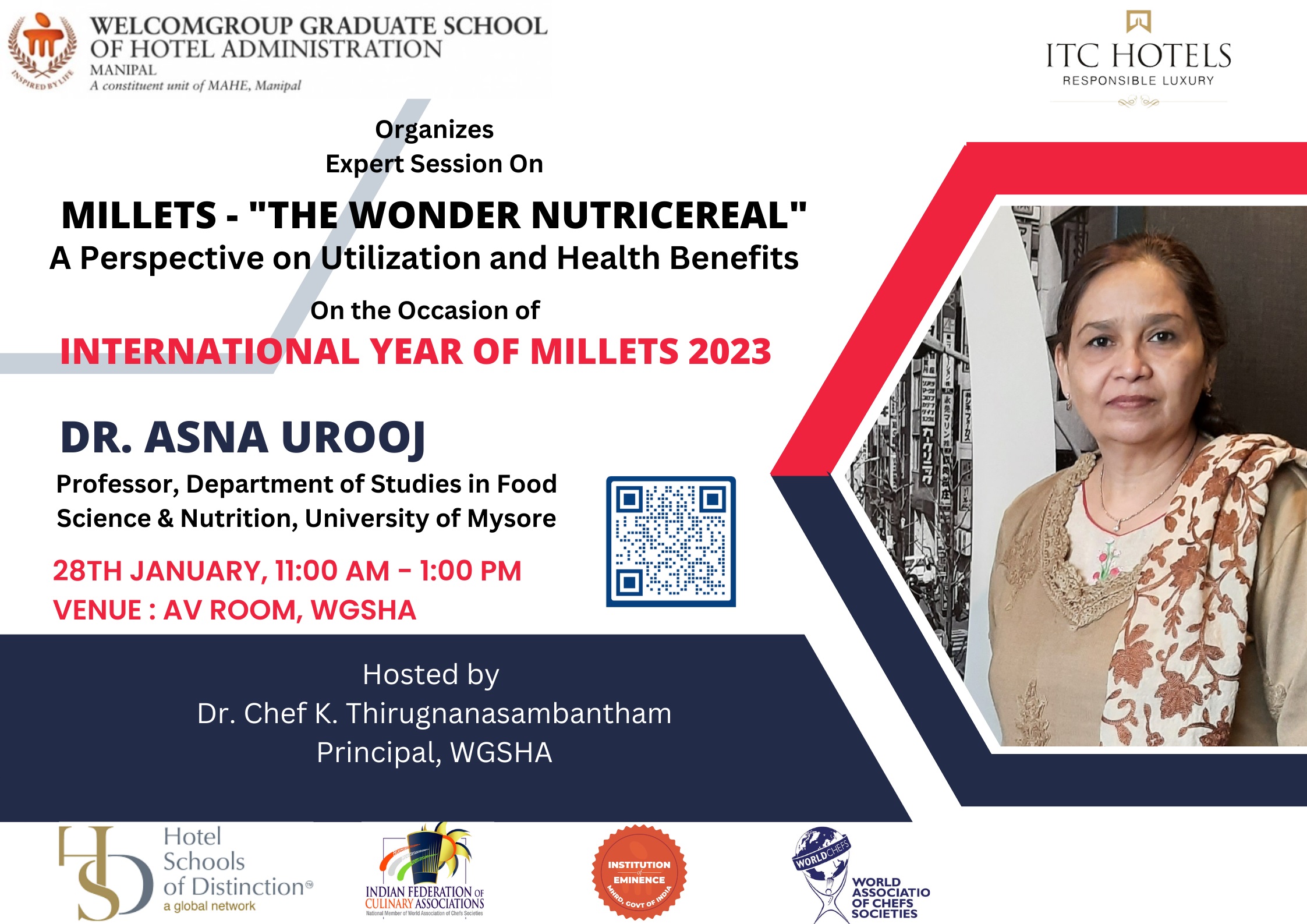 The year 2023 is declared as International year of millets by the United Nations General Assembly. To celebrate this occasion, WGSHA’s Department of Dietetics and Applied Nutrition has organizes an expert session on Millets the "Wonder Nutricereal": A perspective on utilization and health benefits by Dr. Asna Urooj, Professor, Department of Food Science and Nutrition, University of Mysore, Mysuru on January 28, 2023. Dr. Asna Urooj has more than 30 years of experience in - Teaching & research. Her areas of expertise are