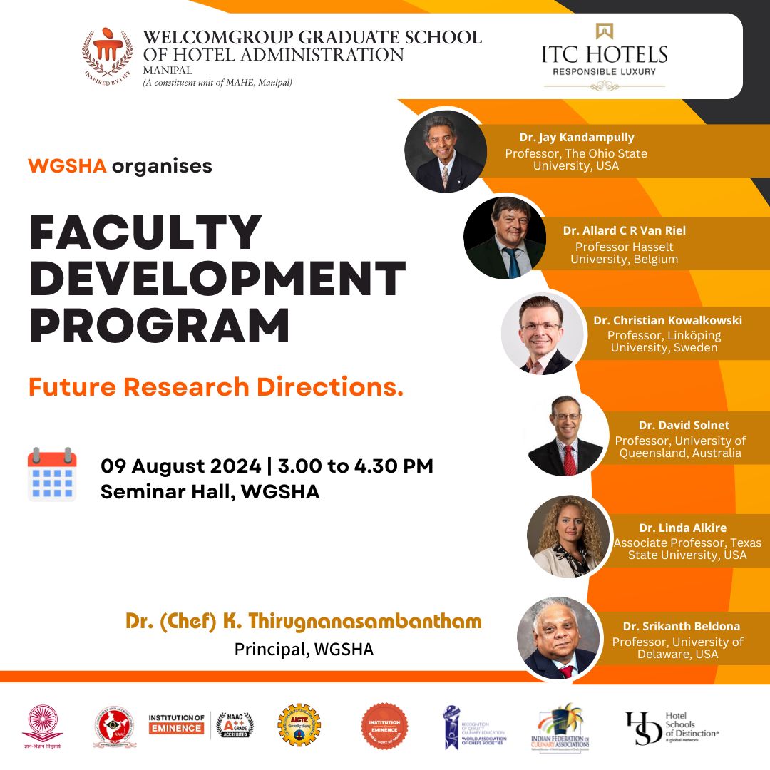WGSHA August 6, 2024: Welcomgroup Graduate School of Hotel Administration (WGSHA) is organizing a Faculty Development Program on "Future Research Directions" on Friday, 09 August 2024 at the Seminar Hall, WGSHA.