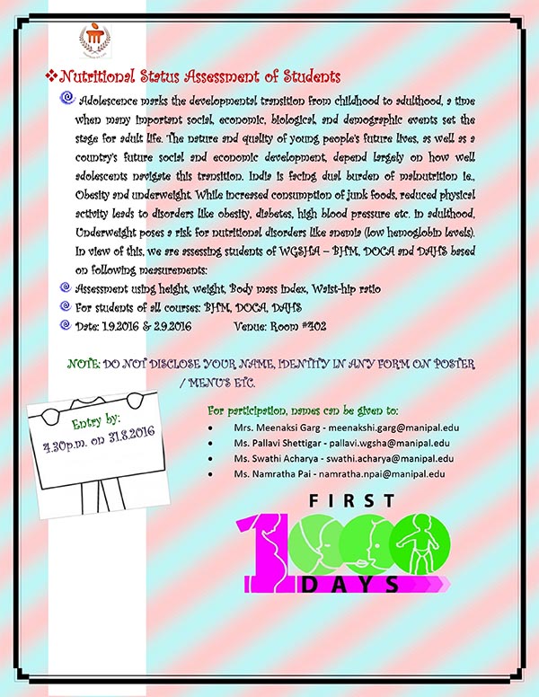On the occasion of NATIONAL NUTRITION WEEK: 1st to 7th September 2016 THEME: “Lifecycle Approach for Better Nutrition” M.Sc. DAN hereby announces exciting competitions for all students Of WGSHA: BHM, BACA, PGDCA, DAHS For more click here
