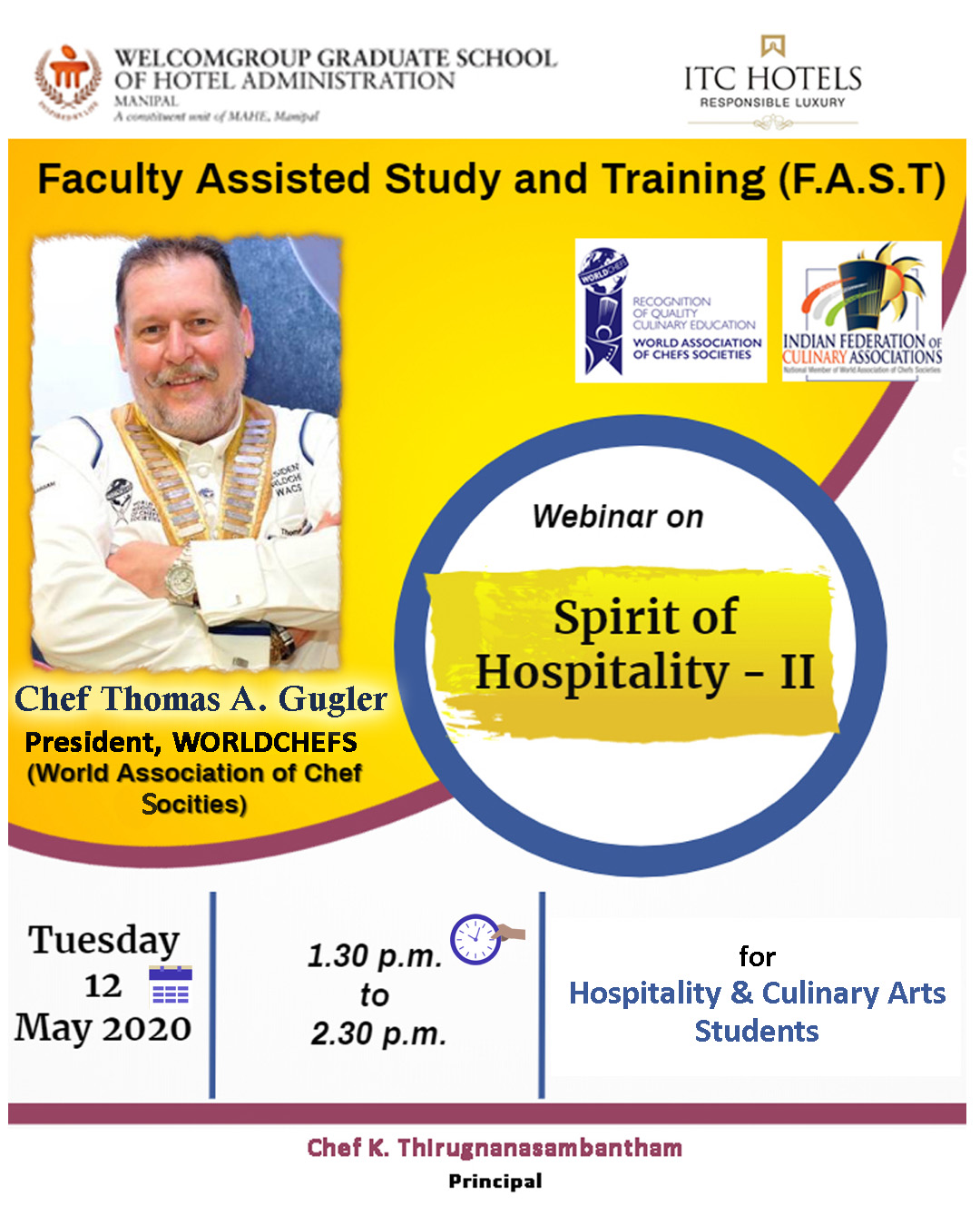 On the 12th of May 2020, students of the final year hotel management and culinary arts courses at WGSHA participated in a webinar "The Spirit of Hospitality II", addressed by the renowned Chef Thomas Gugler, President of the World Association of Chef's Societies, with numerous accolades and years of experience to his name.