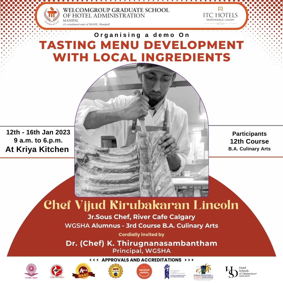 A demo on "Tasting menu development with local ingredients" is organised for the students of 12th Course B.A. Culinary Arts from 12th to 16th January 2022. Expert is Vijud Kirubakaran Lincoln, Jr. Sous Chef, River Café Calgary who is also an alumnus from 3rd Course B.A. Culinary Arts, WGSHA.