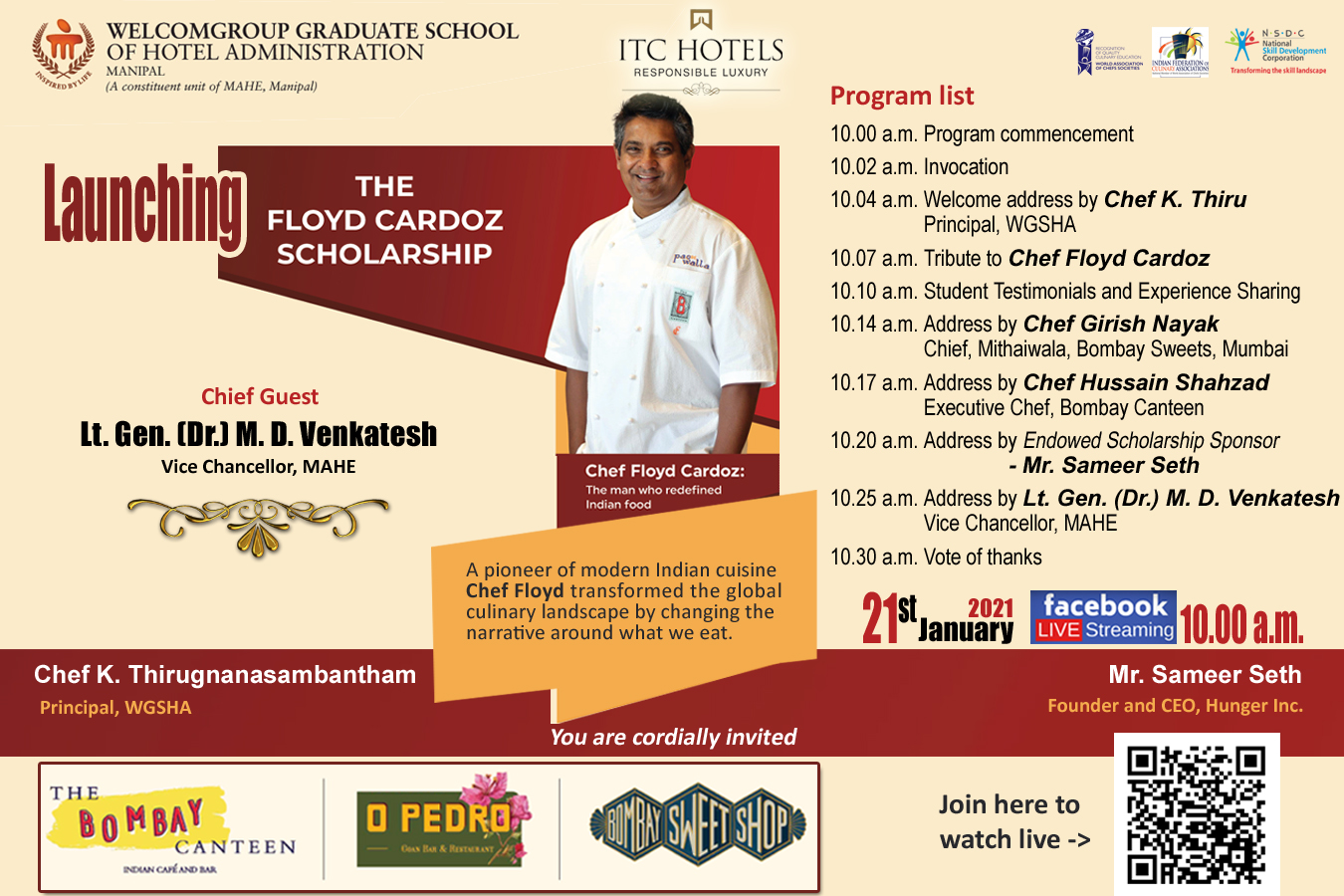 We are happy and proud to share the particulars of a noble initiative of instituting a scholarship by Mr. Sameer Seth, Founder and CEO, Hunger Inc. who runs the popular restaurant “Bombay Canteen” in Mumbai. As a tribute to Chef Floyd Cardoz and his love for teaching, every year, one aspiring culinary student will get the opportunity to receive a fully sponsored three-year Culinary Graduate Degree from Welcomgroup Graduate School of Hotel Administration. This initiative from the founders of Bombay Canteen aims at providing high standard training to promising chefs who aspire to attain a career in culinary arts. We are sure this above initiative adds huge value to the repute of WGSHA and helps to strengthen its networks globally and will be an inspiration for the alumni community to contribute to their alma mater. The Chief Guest for launching the event is none other than our honoured Vice Chancellor of MAHE, Lt Gen (Dr) M D Venkatesh.