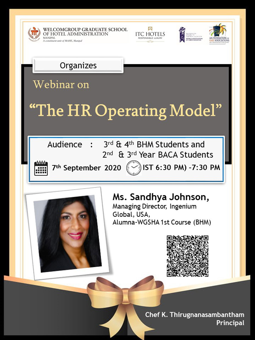 Webinar of “The HR Operating Model” by Dr. Sandhya Johnson, Managing Director, Ingenium Global, USA on Monday (7th Septemeber) at 6.30 pm. Sandhya is the proud Alumna of 1st course BHM who is one of the well accomplished entrepreneur and HR and Leadership Consultant.