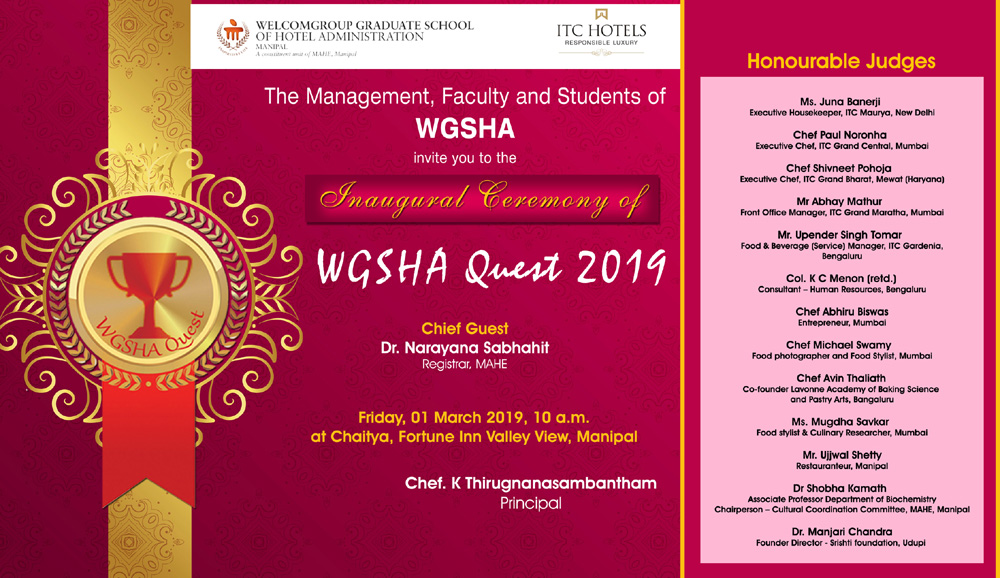 Education and academic competitions are two most important ingredients of human life and these two have always been considered as important issues. To promote education by way of academic competition, we host this annual event. WGSHA Quest is the championships of skills which attracts young hospitality professionals from all parts of India. This event is more than just skills competition; it is a spectacular promotion of young professionals to showcase world-class excellence in hospitality related skills. It is our aim – via this event - to encourage creativity and development of innovative ideas and concepts broadly applicable to the hospitality industry. Looking forward to seeing you at WGSHA Quest 2019!